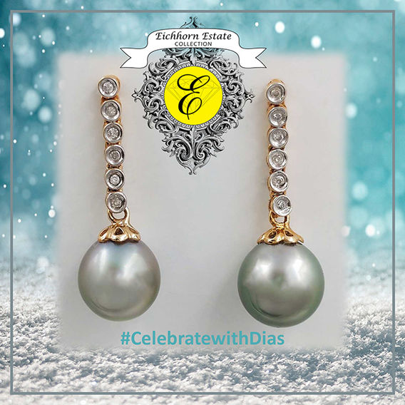 pair greenish-grey cultured pearls each w/6round brilliant-cut diamonds bezel set from drop yellow gold pierced earrings on posts w/friction back stamped: 585 H