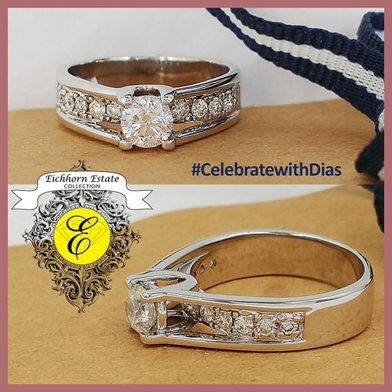 14K white gold and diamond engagement ring 5mm wide cathedral mounting contains 12 round brilliant-cut diamonds set in-line under 0.46ct round brilliant-cut diamond 13=0.76ct total weight diamond. 12: 1.8mm round brilliant-cut=0.30ct I1-I2 G-H very good proportions. Center 4.72x4.72xapprox 3.10mm thick faceted girdle laser inscribed: CD0046B1213273 shank engraved with star and same laser inscribed number polished away, 0.46ct I1 H-I very good proportions size 5.75 weighing 4.64grams - SOLD